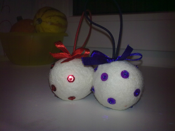 Какие классные снежки получились! Я тоже в прошлом году делала парочку таких, только не на шерстяные нитки наматывала шерсть, а на пластиковый полый шарик.