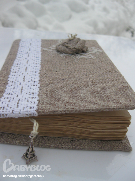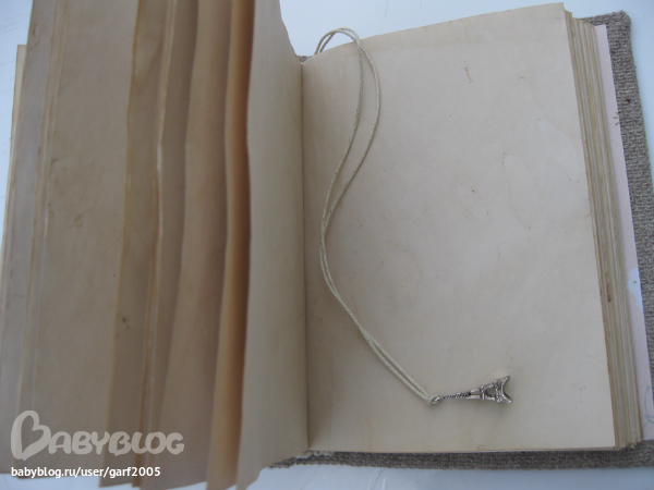 Не устояла я и перед созданием блокнота. Решила делать под старину. Странички состарила в кофе, формат у него А6, тканевая обложка, ручной переплет, как закладочку использовала вощеный шнур и подвесочку эйфелевую башню.