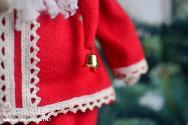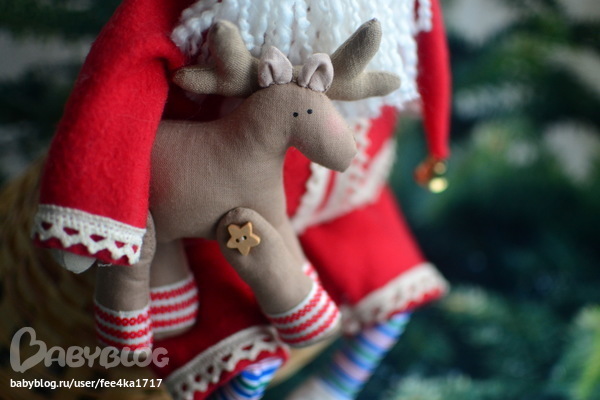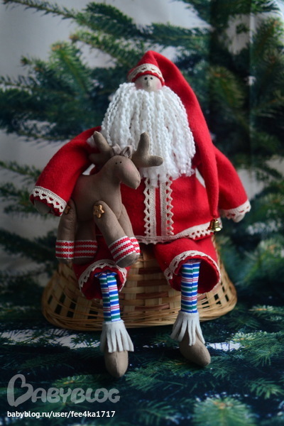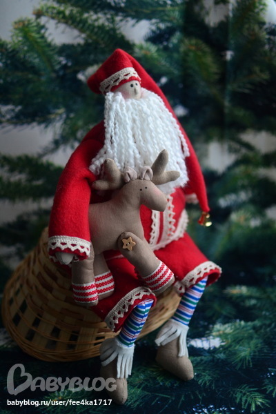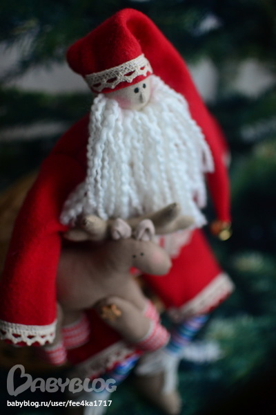 Вот и он, толстяк, так и хочется потискать. Кружево на шубке, колокольчик на колпачке и верный друг олень подмышкой.