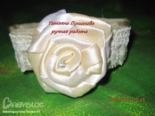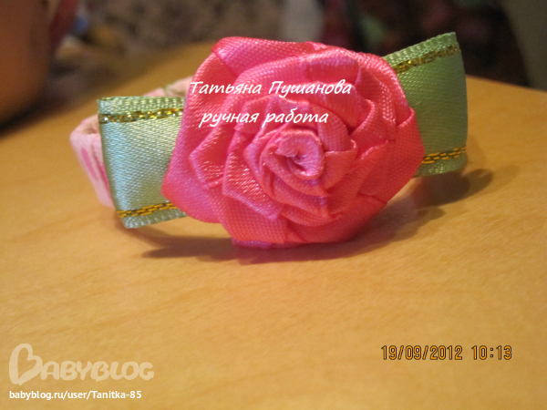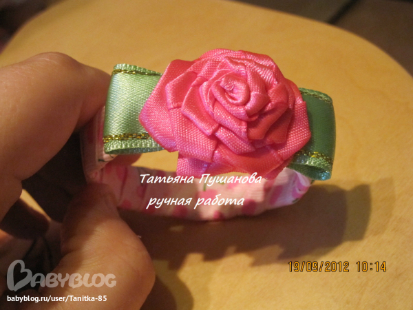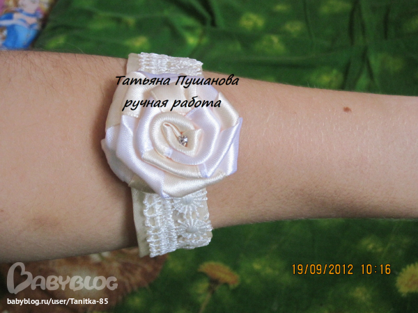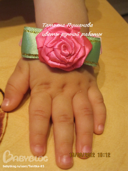 Основа браслета - пластиковая бутылка (вырезанная "колечко"в узкой части), обёрнутая репсовой лентой. )