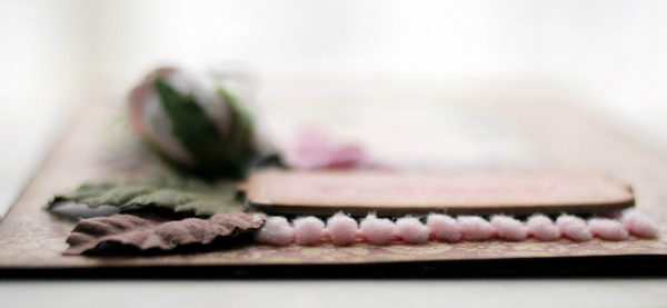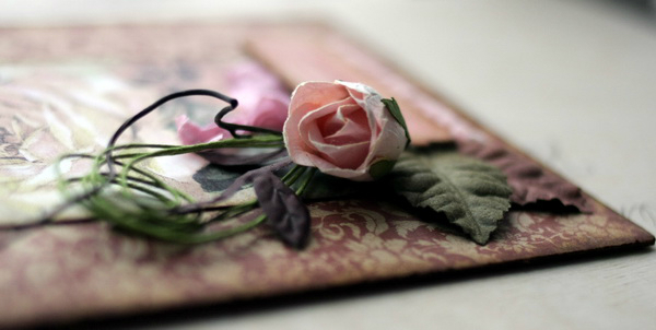 Края затонированы дистресс чернилами, цвет Винтажное фото. Листики из Тайланда, розочка - примовская, ну ленточки с листиками и шебби-лента в комментариях не нуждаются. А вот веточки из букетика от Скрапберрис, сам букетик и листочки мне в нем не понравились, а веточки пошли в дело). Подложка под надпись - чибпорд Basic Grey, он толстый, поэтому саму надпись переводила, распечатав зеркально на струйном принтере на пленке. Получился такой винтажный капиллярный эффект))