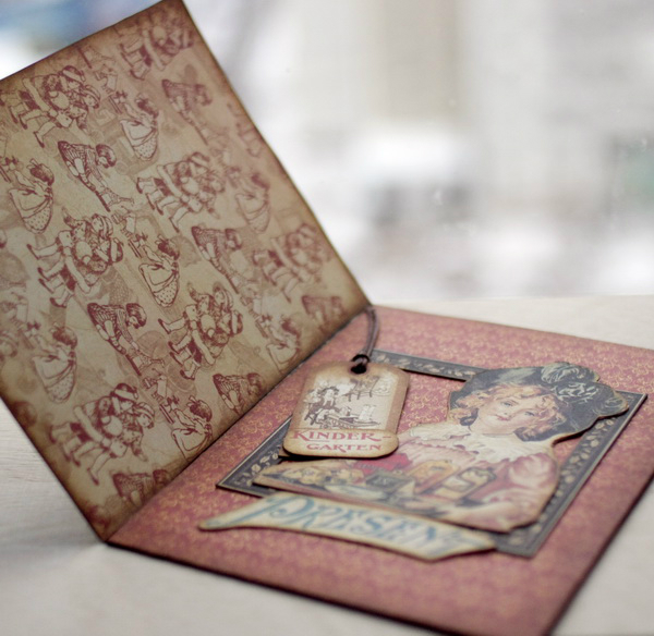 Справа - это карман для денежного подарка, поэтому и надписи соответсвующие (у Графики нашлась и надпись "детский сад", и "подарок", правда все на разных языках - такая вот интернациональная открытка получилась. Другой ракурс: