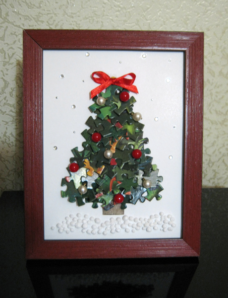 Идейка подсмотрена в инете. Делается просто и быстро, а выглядит, на мой взгляд, оригинально. Каждый пазл приклеен на скотч, поэтому елка объемная и можно пошевелить каждую "лапу". Снег - из вареной пенопластовой крошки. Поскольку ребенок - любитель чего-нить поклеить и покромсать ножницами, ему досталась почетная миссия отрезать кусочки скотча и клеить снег.