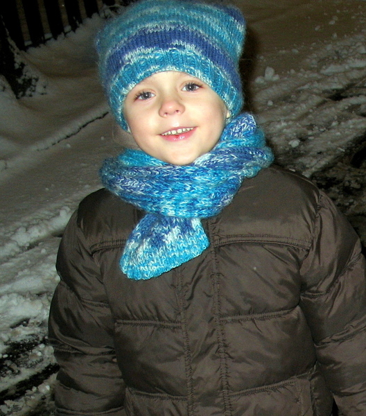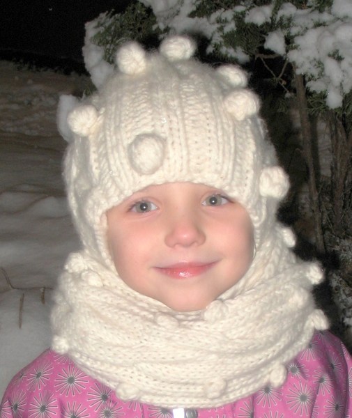 Связала в этом году доче, но шарф оказался очень тяжелым - спадала шапка... Распустила и связала шарф отдельно , в одну нитку уже.