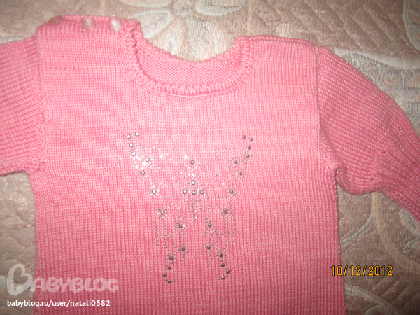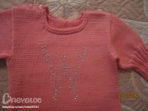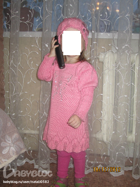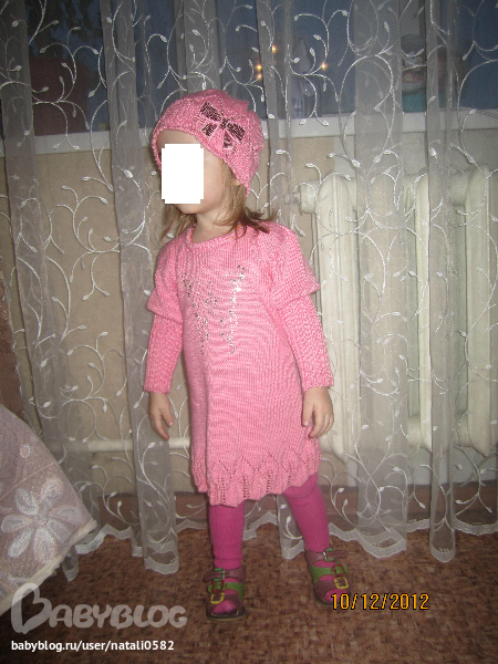 К нашей шапочке, которую связала я Шапочка на весну для дочки). Рукава - фонарики, нам платье пока немного велико...На горловине нам сделали пуговки, в схеме не предусмотрены. Грудь украсила наклейкой (71руб.))