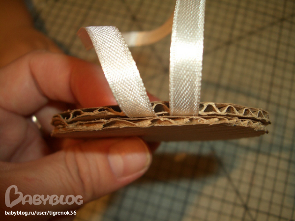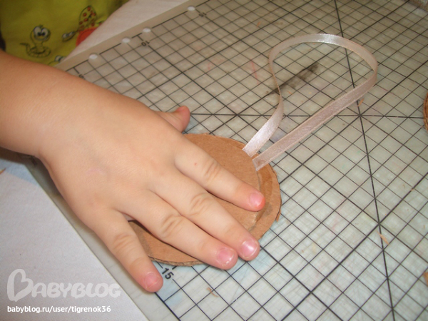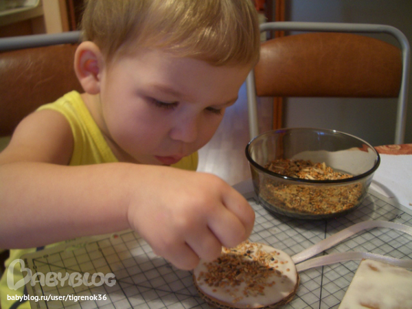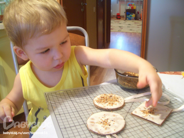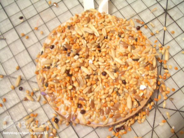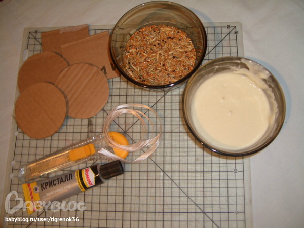 Надо: картон от коробки, зернышки, ленточка, клей, мука разведенная водой до консистенции густой сметаны, так, чтобы не стекала с заготовки.
