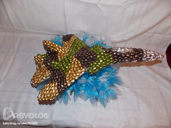 конфет там штук 800 наверное мелких сосалок,это было самое сложное завернуть их в полисилк и приклеить))) каркас это пенопласт вырезанный по чертежу ))