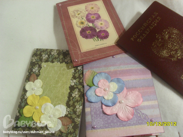 Вот сделала три обложки на паспорт,из того что есть...скрап-бумага, плоские цветы..полубусины..смотрите в общем)))