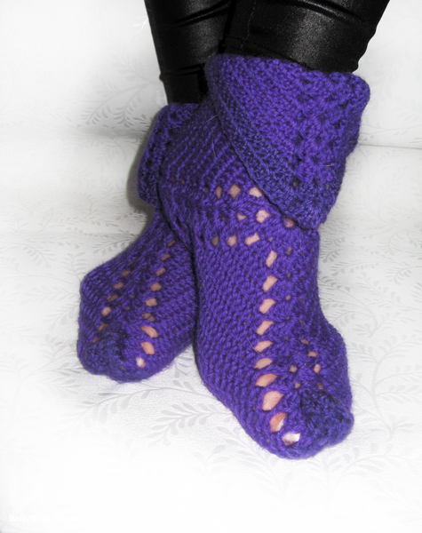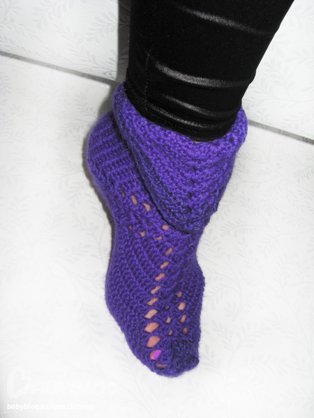 крючком вяжем по схеме квадрат, сторона у которого равна длине стопы + 2см. потом сшиваем. В районе пятки можно ажур не вязать.