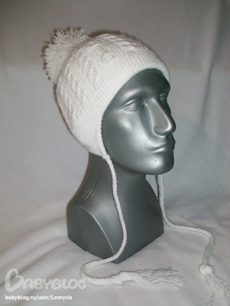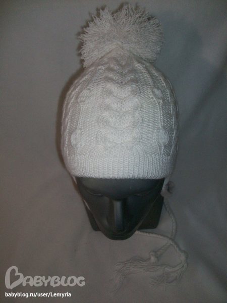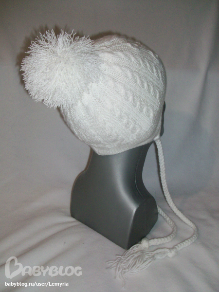На окружность головы 50-52см со съемным помпоном, цвет снежно-белый, двойная вязка (машинная вязка внутренняя шапочка и ручная вязка - внешняя шапочка с узором), состав пряжи - 75% акрил, 25% шерсть, вшит утеплитель Тинсулейт (США) 150 гр/м2, подклад односторонний низкопиллингуемый флис. Данная модель отлично закрывает ушки и шейку ребёнка. Самый современный утеплитель и многослойная вязка позволяет надевать шапочку и в ветренную погоду до -30 градусов С.