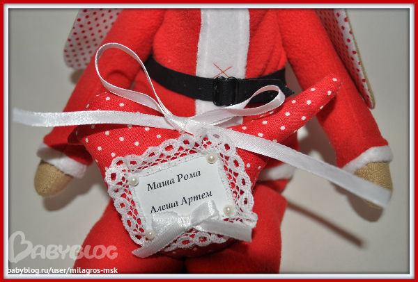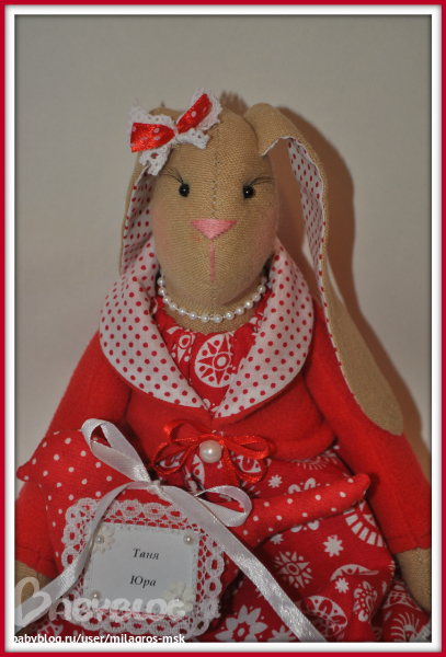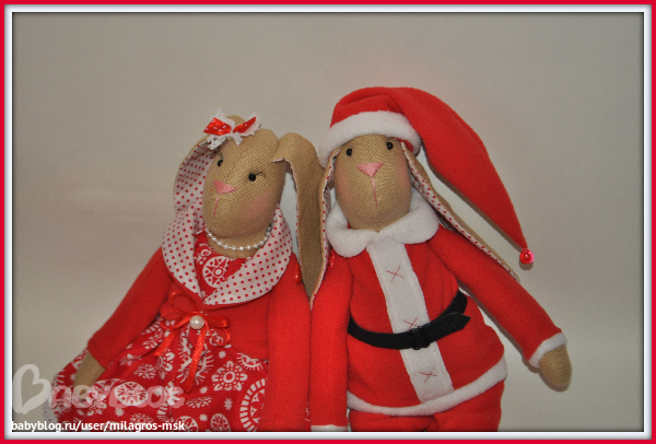 Оль,очень нравится!!!!!! Зайка такая нарядная получилась,ну прям невеста )))))))а жених настоящий дед мороз))))))))))) Напиши мне плиз в личку сколько твои красавцы стоят и еще у меня тонна вопросов к тебе )))))