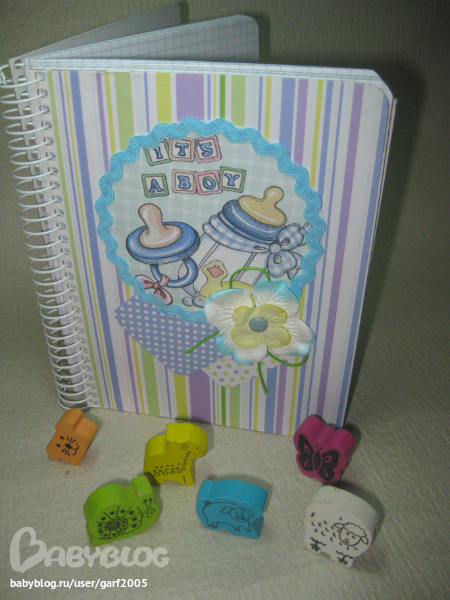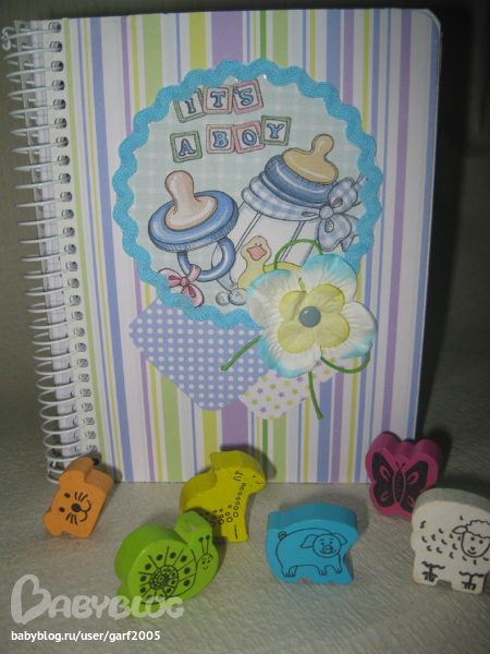 СкрапбукингБлокнот состоит из 150 листиков в клеточку. Разделен на 2 части. Первый год жизни и второй год. В первом году таблички с ростом, весом, зубками и первыми умениями. Во втором разделе: новые слова, умения и достижения.