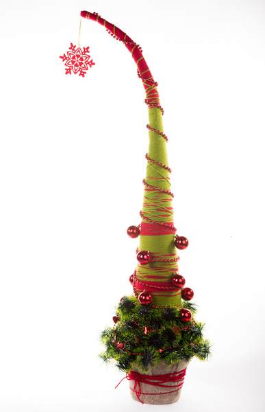 6. На верхушке конуса должно остаться отверстие, туда мы и будем всавлять кончик. Я долго ломала голову, как сделать кончик загнутым, некоторые шьют из ткани. Я взяла оставшийся ватман, опять же сделала из него конус, погнула его, что бы он принял загнутую форму и смазав клеем вставила в отверстие на верхушке основного конуса елки. Сначала он был кривой и страшный, но как только я обматала его нитками, кривизна ушла.