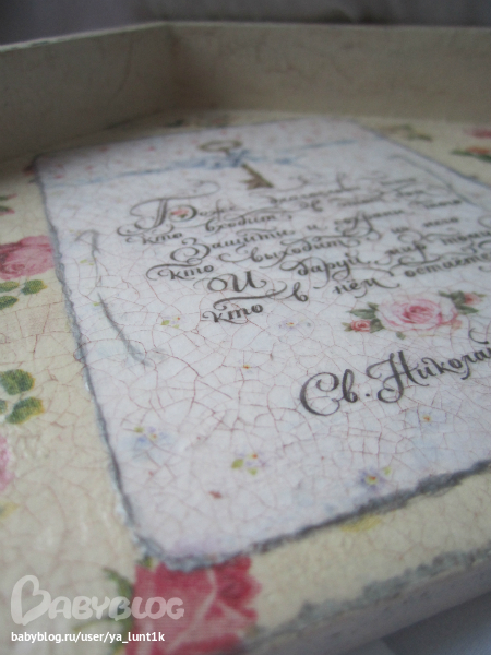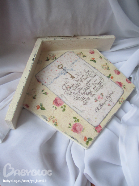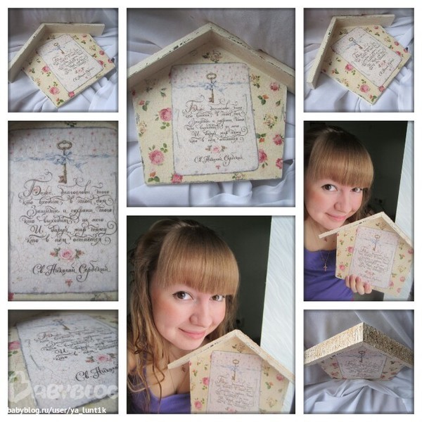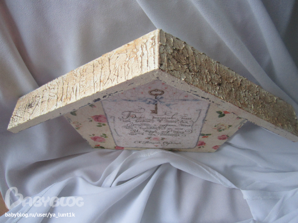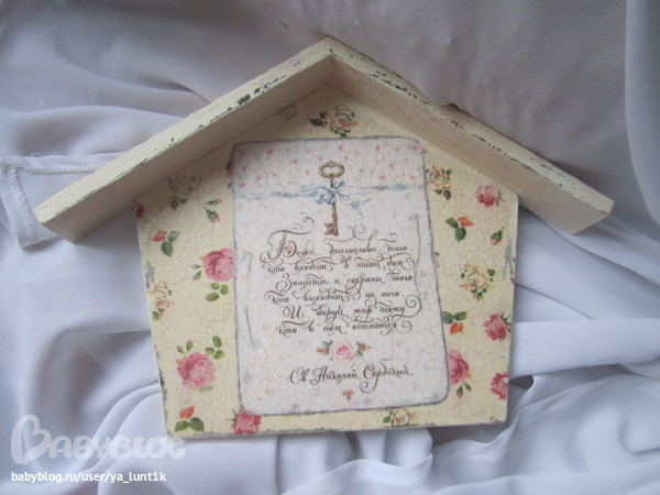 Ключница сделалась на одном дыхании..То что я хотела то и получилось=)И салфетка приклеилась на отлично и декупажная карта.И шпаклевой мне понравилось работать,сделать на крыше вот такой рельеф=))