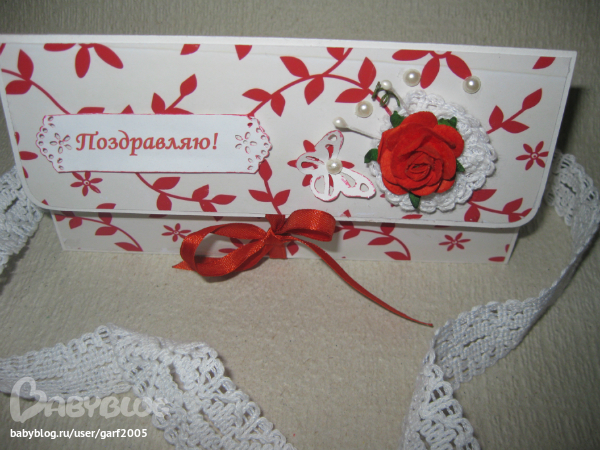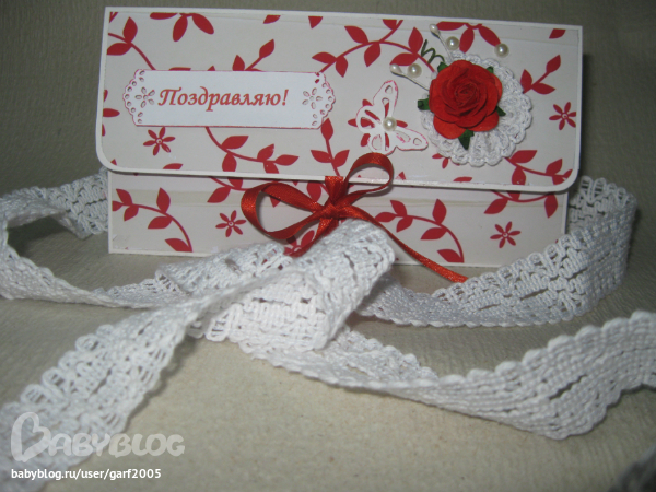 СкрапбукингНужно было срочно сделать "упаковку для денежки". Предназначается он для женщины в День Рождения. Делался очень быстро и легко. За основу брала акварельную бумагу, углы скруглены, оклеен скрап бумагой. Украсила бабочкой, полу бусинами, тычинкой, розочкой и кружевом.