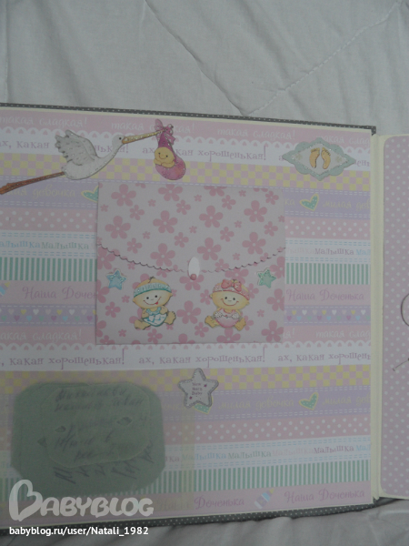 На форзаце поместила конвертик самодельный, там УЗИшечки, и прозрачный карманчик - там бирочки (да-да, в нашем роддоме до сих пор вешают вот такие страшненькие клеенчатые бирки, как у наших мам!!!)