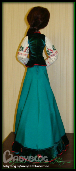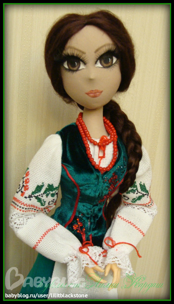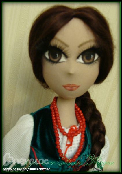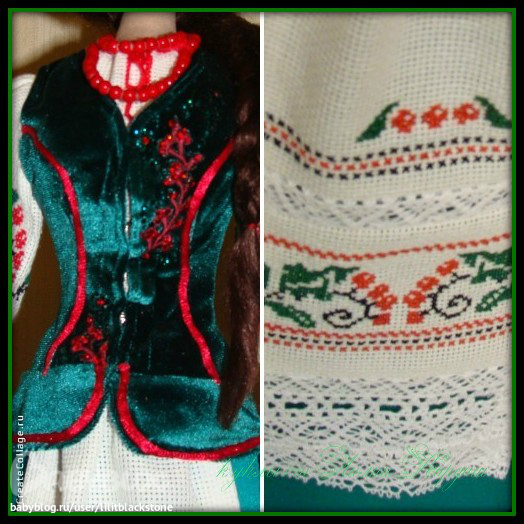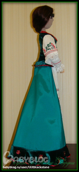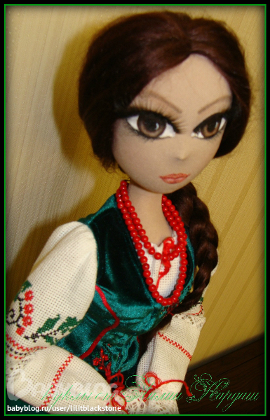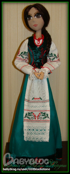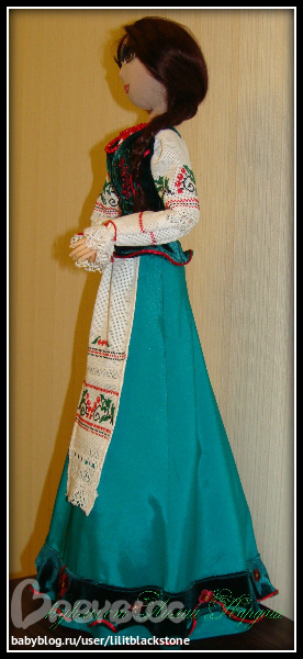 Сшита она из габардина, набита синтепухом, волосы - волокна крапивы, лицо-акриловые краски, костюм - бархат, хлопок, ручная вышивка мулине, шёлковый шнур, фатин, х/б кружево, натуральные коралловые бусы, стразы сваровски, кисти рук - полимерная глина.