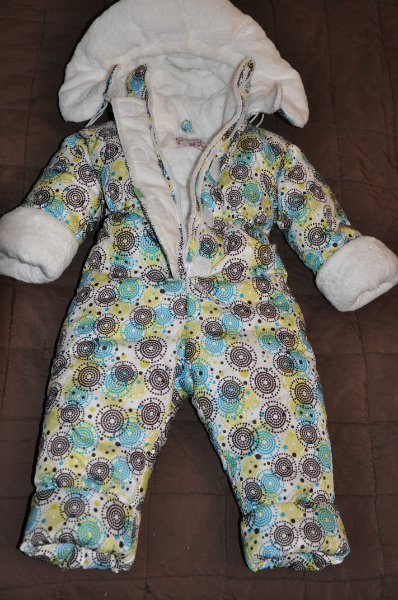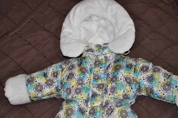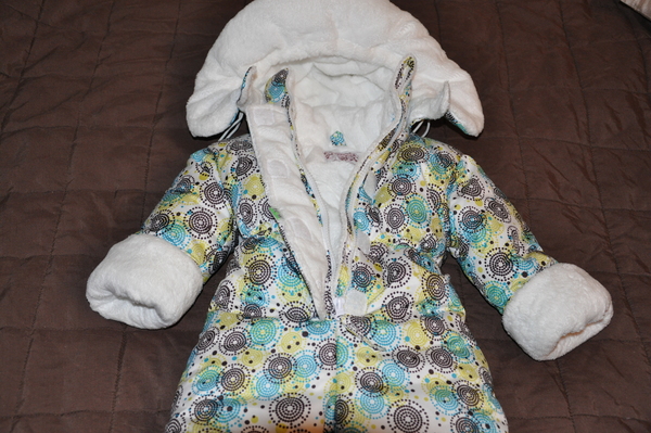 Комбинезончик - просто чудесный!!! Верхний слой (плащевка) цветной такой, классный, очень интересно смотрится. А во внутренний - я просто влюбилась)) кажется, что он очень теплющий и такой мягенький))) Так что колготки и водолазочку на ребенка и хватит))) Не знаю как вы сдерживаетесь, но я б была бы не против и себе такого чуда!