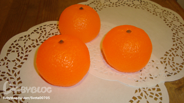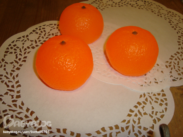 Замечательные мандаринки!!! Точно как настоящие. А пахнут тоже мандаринами? У вас дома не пытались мандаринки ваши попробовать на вкус?)))