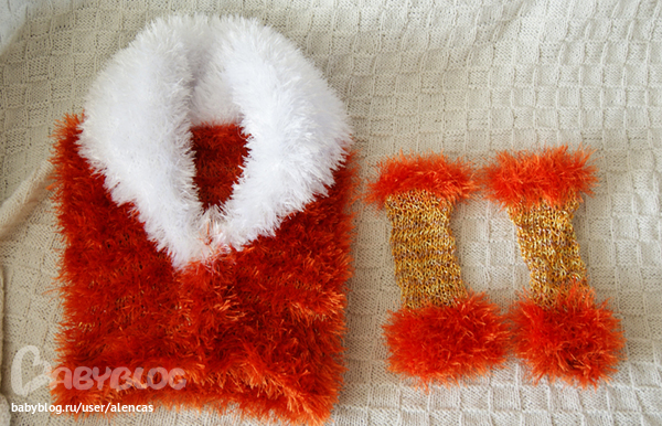 Пряжа: травка + вискоза с люрексом цвет золото-серебро, марку не помню. Очень удачно эта пряжа вписалась в травку, чередовала ряды, чтобы костюм не получился слишком уж тяжелым и жарким. Расход 300 гр травки и 100 гр. пряжи с люрексом (она придает костюму гламурно-новогодний блеск)