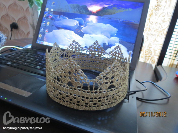 я спец по коронам уже кучу их связала. лучше не крахмалить а желатинить, развести желатин в водичке комн темп, потом через часа полтора на медленный огонь ( я на баню ставлю), как раствориться желатин, немного остудить, потому туда опустить корону и натянуть на форму нужного диаметра, я обворачивала банку дет питания полотенцами, но лучше получается когда форма твердая, поэтому потом использовала банки стеклянные, голову куклы, кастрюльку и т п.