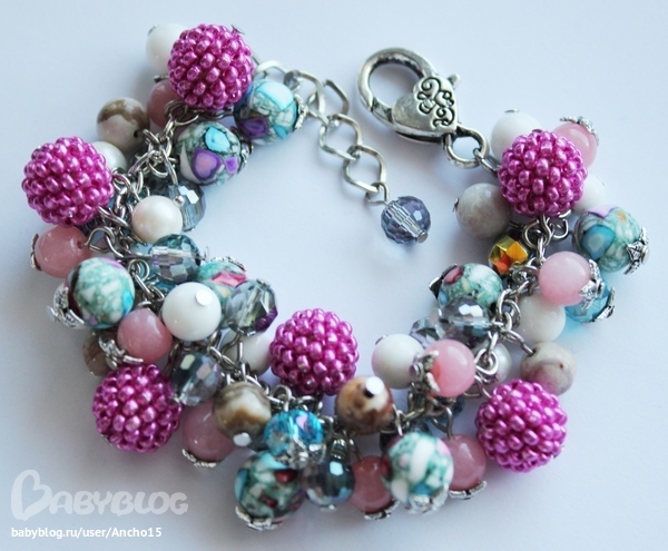 Браслет выполнен из бусин, оплетённых чешским бисером, яшмы, нефрита(крашеного), натурального жемчуга, гранёных бусин, других натуральных камней и фурнитуры под серебро.