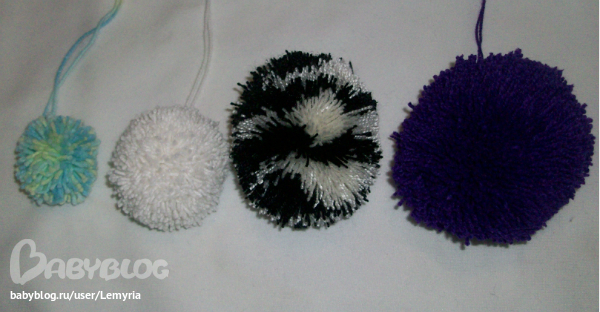 Изготовим ниточные помпоны разных диаметров: 3,5 - 5,5 - 7 - 9 см - однотонные, меланж, из 2-х и более цветов. Стоимость 10 - 20 - 50 - 70 рублей соответственно размеру. Помпоны плотные, очень пышные.