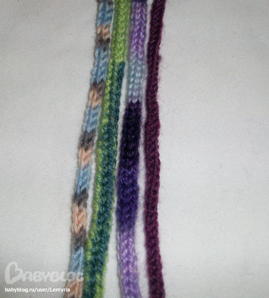 Вязаный шнур (жгут) - предназначен для декора одежды и аксессуаров, создания украшений. Цвета разнообразные - меланж, короткосекционные, длинносекционные, однотонные. Стоимость от 15 рублей за метр. Толщина шнура варьируется в зависимости от выбранной пряжи от 0,4 до 0,8 см. Метраж не ограничен.