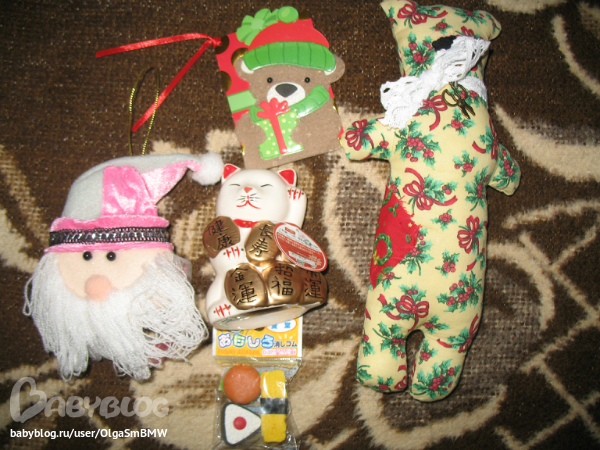 Это нам.Мишку Андрей забрал себе и ластики.Гномика повесим на ёлку ,Манеко неко уже на своём месте и откраточка ну такая она клёкая.плюшевая.