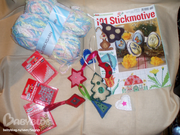 Радость моему Хомке: ниточки мягкие и очень приятные на ощупь, бусинки, журнал с весенне-пасхальной тематикой - доча уже показала, что маме надо вышивать (полжурнала где-то =) )