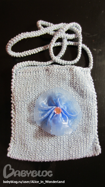 Ну не делать же для неё отдельный пост, поэтому она тут повисит. Один моточек пряжи Луна (100м/50 гр) и кусочек ленточки и пуговка. работа занимает мин 15-20 и детская сумочка готова.