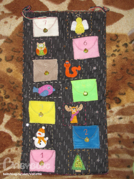 Я в прошлом году очень поздно узнала, что есть такая прикольная весчь))) В этом году вспомнила 5 декабря, за две ночи сшила на 30 кармашков, правда оформила только наклейками новогодними и ленточками... Чувствую, надо начинать прямо с января оформлять на следующий год)))