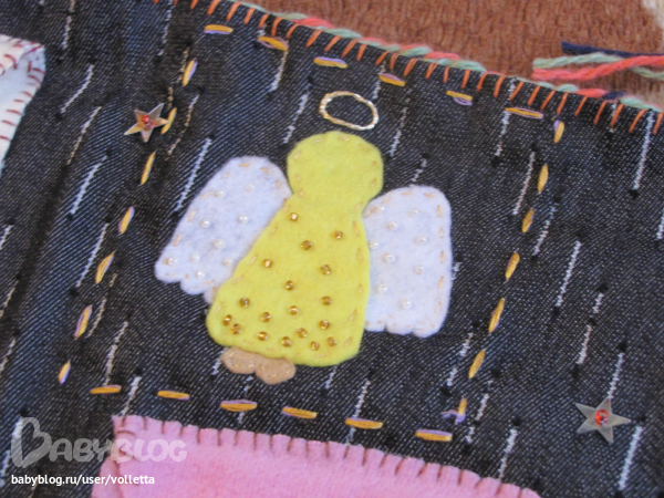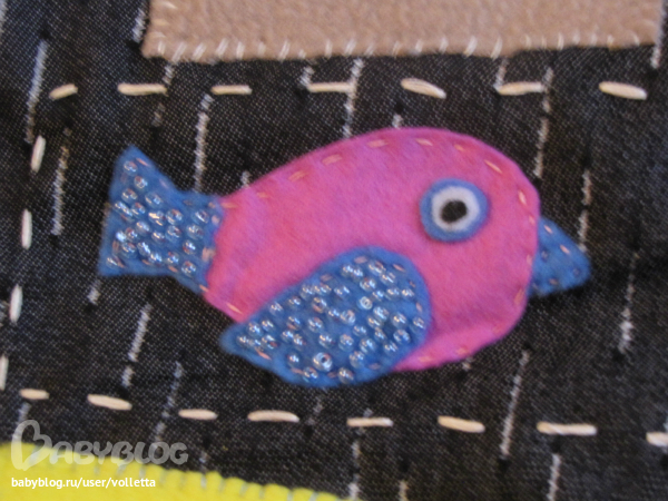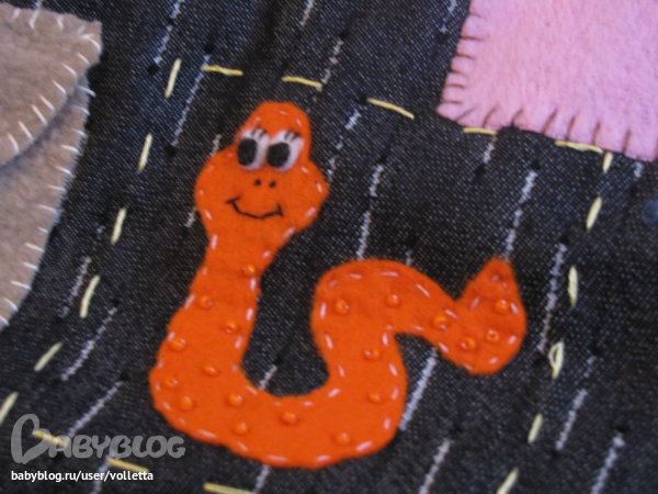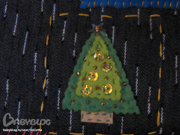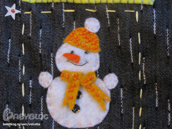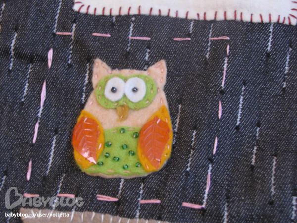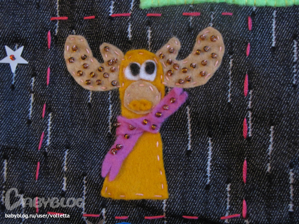 Материал: двухслойный джинс, кармашки - флис, аппликации - фетр, нитки мулине, отделка - пайетки, бисер для каждой аппликации. Так что все блЯЯЯстит)))