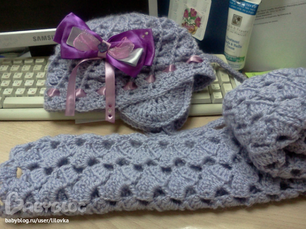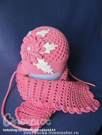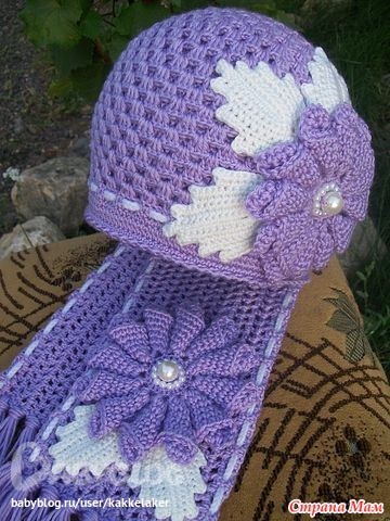 шапочка связана из двух))) нижний слой - просто из столбиков с накидом (верх) затем столбики без накида. Верхний слой - по схеме, которую дала selma, далее так же столбики без накида. Затем просто соеденено вместе и обвязано рачим шагом.