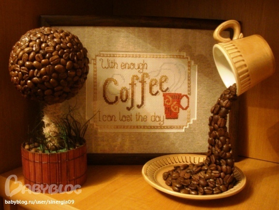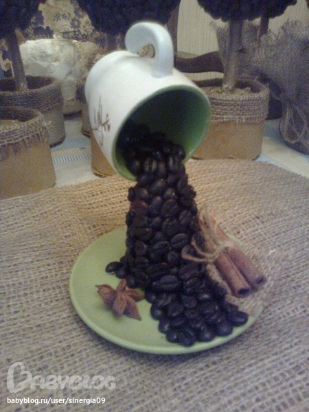 Я не знаю как это было в оригинале. Я делала это так - чашку и блюдце соединила проволокой (сталистой), каркас из проволоки "залепила" текстурной пастой, затем обклеила зернами(горячий клей термопистолет).