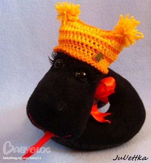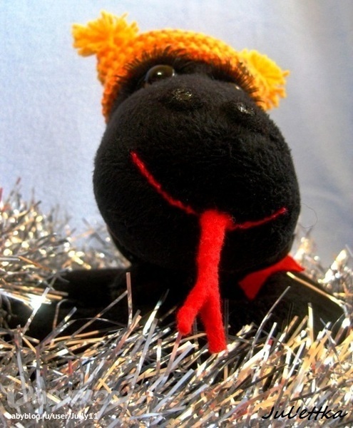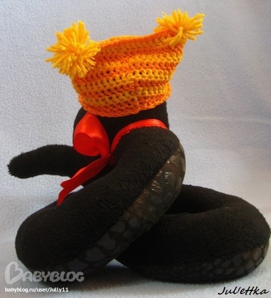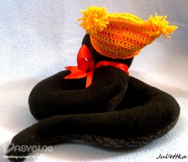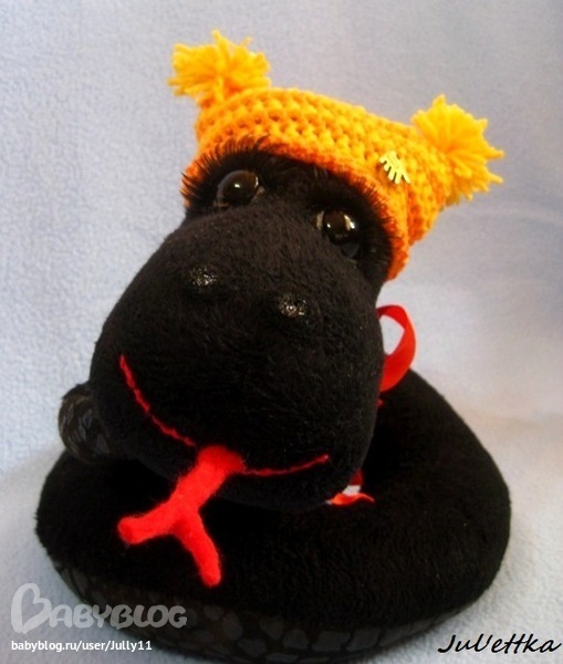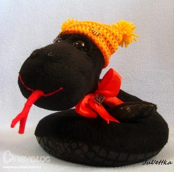 Игрушечный мир - животныеЗмейка Настасья родилась 15 декабря, и очень сильно хочет стать символом 2013 года -года черной змеи,поэтому и родилась она черненькой, но так как сама по себе она очень яркая и жизнерадостная, она носит яркую шапочку с помпончиками и яркий шарфик-ленточку с сердечком. Змейка очень мягенькая, и принимает разные позы. Приносит в дом теплоту и любовь!