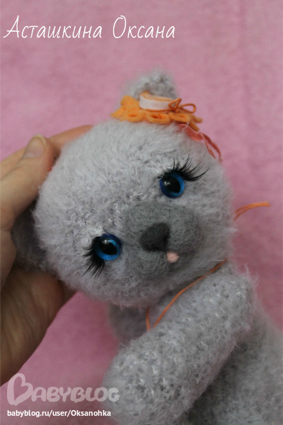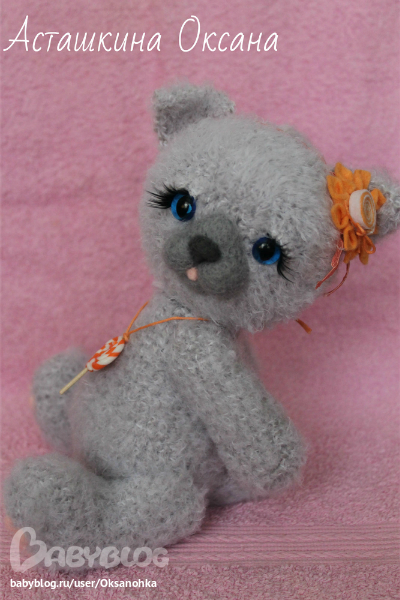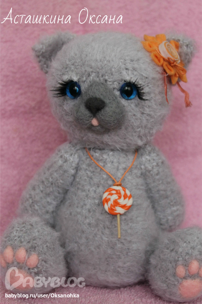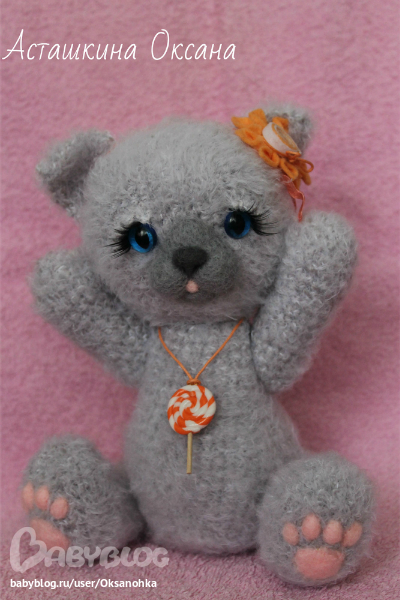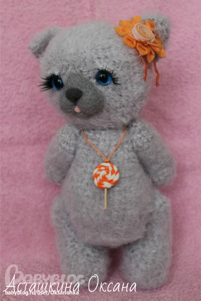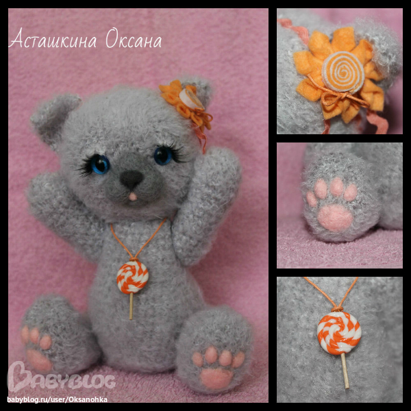 Игрушечный мир - животныеМаленькая пушистая кошечка Бася, озорница, которая подарит своей мамочке леденец!!! Связана из фактурной пряжи, 6 шплинтов, мордочка и подушечки на лапках - сухое валяние. кошачьи глазки, ресницы, украшение - цветок из фетра, на шее подвеска леденец из полимерной пластики на вощеном шнурке.