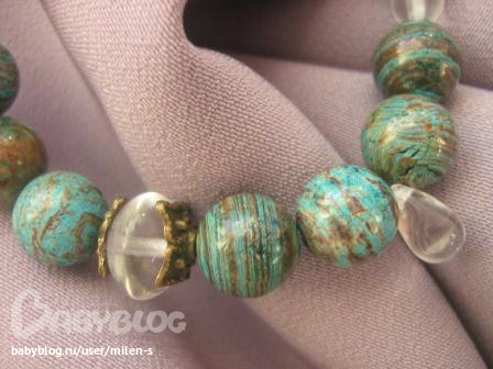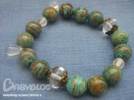 Еще один браслет сотворился накануне из голубой яшмы с коричневыми прожилками, с чешскими стеклянными бусинами (вставки), прозрачные и матовые.