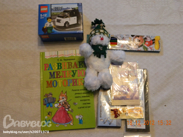младшему очень интересненькие наборчики(у нас таких ещё небыло) собираються маленькие машинки, конструктор лего ( сына очень любит этот конструктор) , развивающую книжечку, карандаши и снеговика сын вазял себе но мы его потом на ёлочку повесим ))) ( ну снеговика конечно )))