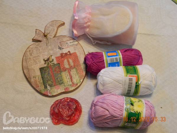 Ну а это мне )))) ниточки (что я очень люблю в любом количестве и мне всегда мело ))))),мыло в виде розочки)))))очень и очень красивая доска (я так понимаю декупаж? впервые вижу вживую )))) и наборчик для ванны ))) (хотя его может ещё старшая заберёт ( )
