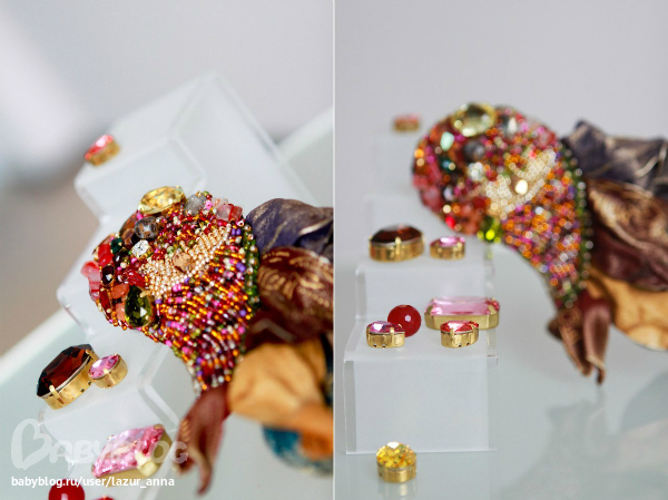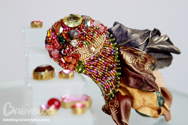 Турецкий огуречик создан из каменьев и кристаллов Сваровски, бисера, кожи и замши.