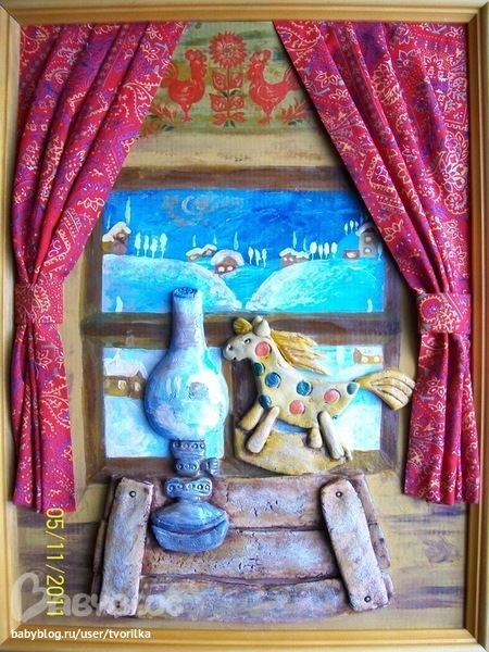 окошко и все что за ним нарисовано, столешница, лампа и лошадка - соленое тесто, зановесочки из ситца старинного, у бабушки завалялся!