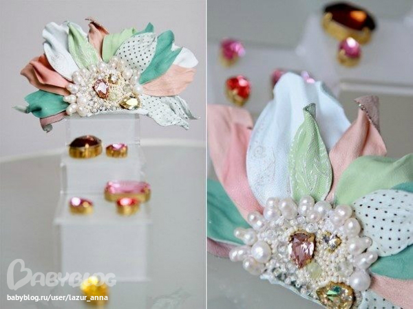 Натуральный жемчуг, кристаллы сваровски, кожа. Модель заколка-автоматик