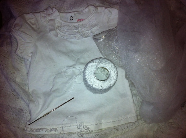 Даже не знаю в какую категорию отнести)) в шитье или в вязание. Ну, в общем у нас завтра праздник в саду, мы будем естественно снежинками. Химический китай за 1000 покупать не хотелось, поэтому купила футболку белую глория джинс на распродажи за 120р, фатина два вида на 150р - белый мягкий и белый с золотыми блестками более жесткий, нитки хб мерсизированные были с лета, и стразы тоже завалялись в сундучке.