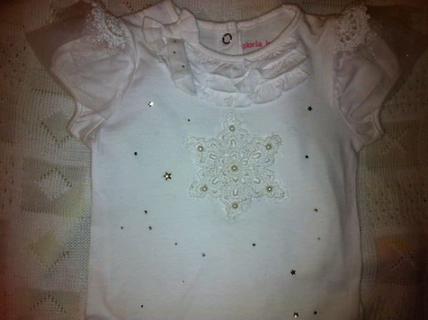 Тоже самое на руковах. Далее связала снежинку и соединила ее с блестящим фатином, обрезала фатин больше на 1 см чем край снежинки и пришила к футболке. Добавила бусин и стразы.