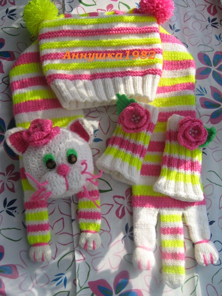 Весь комплект связан спицами по кругу, мордашка кота, цветочки - крючком
