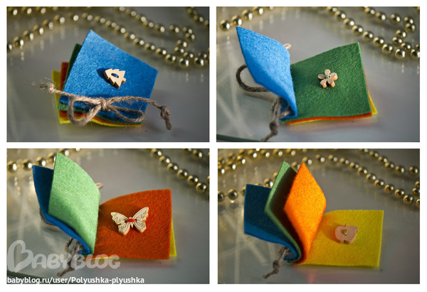 После недели сладостей из нашего адвент-календаря, у Плюши разигралась аллергия...Теперь ей кладу только подарочки. Сегодня ночью пошилась такая простая книжка. Заодно, вспомнили по-английски цвета и предметы. Поиграли в ассоциации. Можно развязать веревочку, и играть отдельно страничками