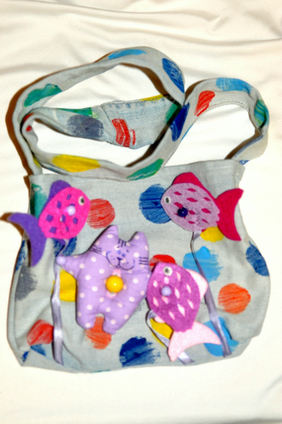Сумочка из джинсовой ткани, рыбки из фетра, все снимаются и надеваются обратно на бусинки, а еще в лапки кота тоже могут угодить)