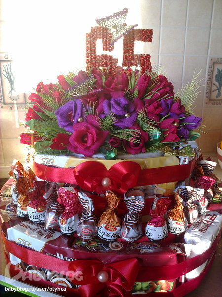 видно, что старались! фиолетовые цветочки, на мой взгляд, здесь не айс. и было бы еще лучше, если бы поднапряглись, накрутили еще цветов и нижний ярус тоже украсили цветами, а не просто конфетами. они портят вид.