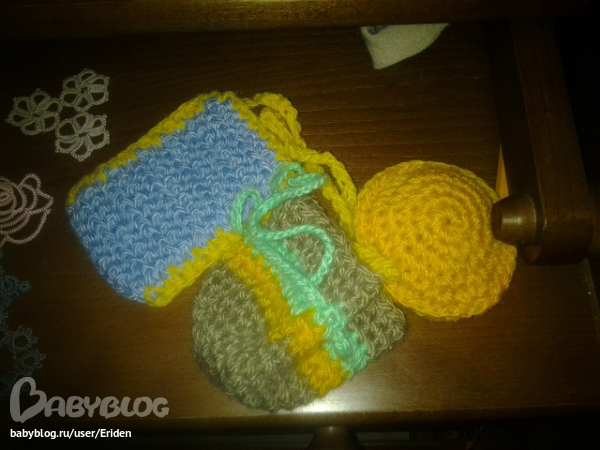 Сумочка, игольница и чехольчик от Ольги. Офигенские! Примерила- чехольчик четко сыне сейчас на голову налезает. С учетом того как Тима активно ползет к телефону- скоро понадобится. А пока привесим на кроватку вместо рождественского чулка.